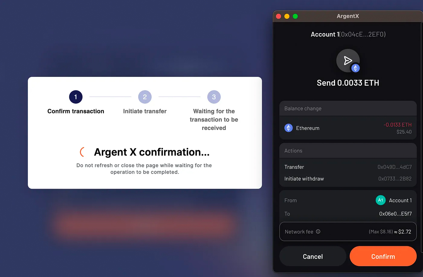 Confirm the transaction on the Argent wallet. It will deposit the tokens in the Starkgate bridge and a small ETH fee to the one-click service provider.