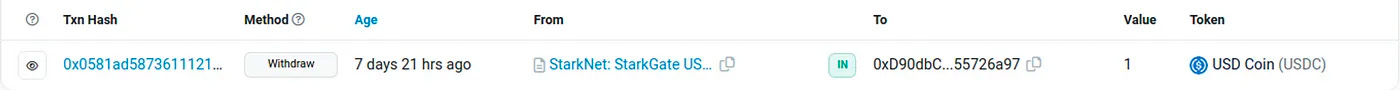 Double-checking is always a must and users can find the confirmation also on Etherscan. The final stage of the withdrawal should look like the image below, where the USDC token has been transferred to the L1 recipient account.