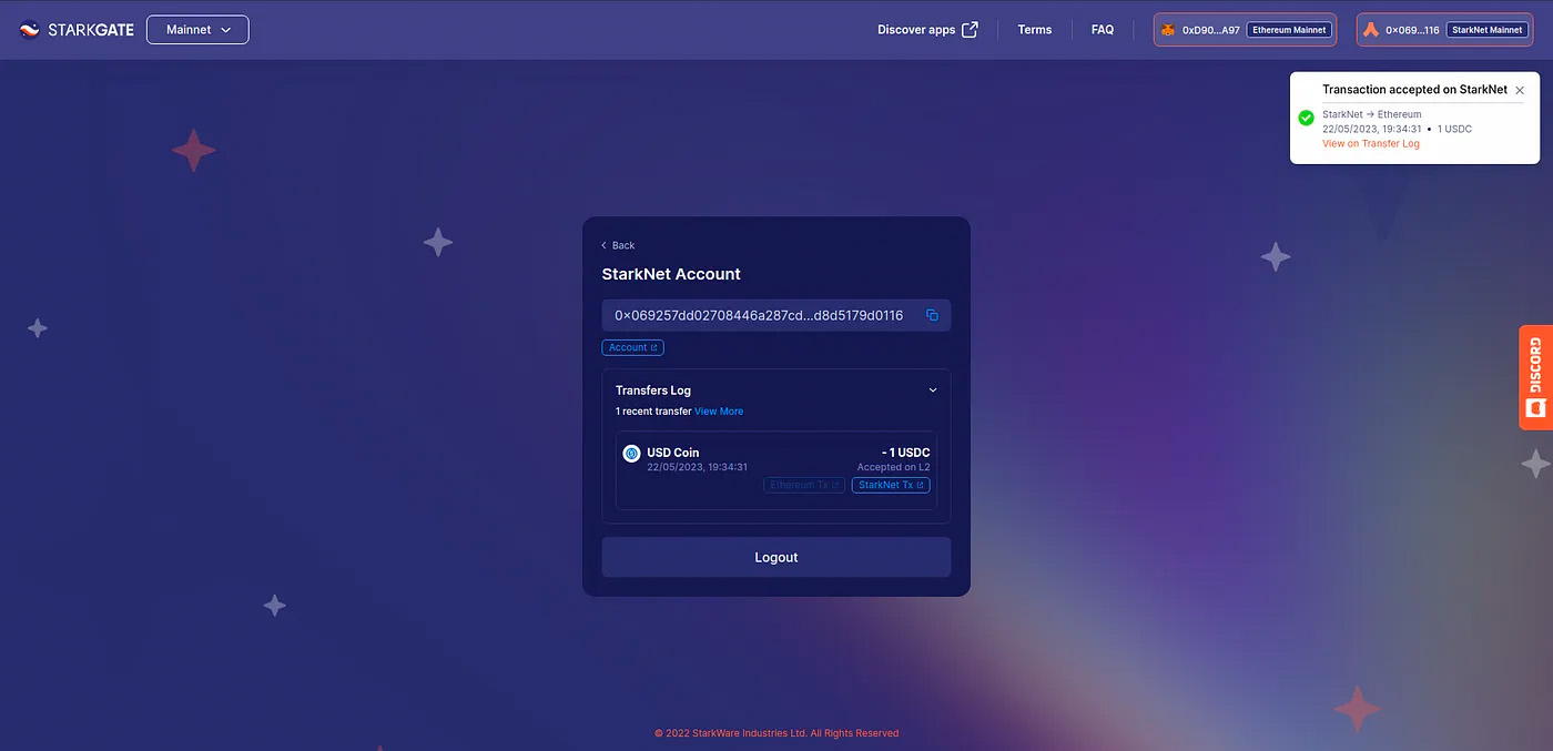 In the meantime, the user can go back to Starkgate to check the status of the withdrawal request. To check the withdrawal history, click on the Argent widget located in the upper right corner. Once it is accepted on L1, users will be notified on Starkgate via popup.