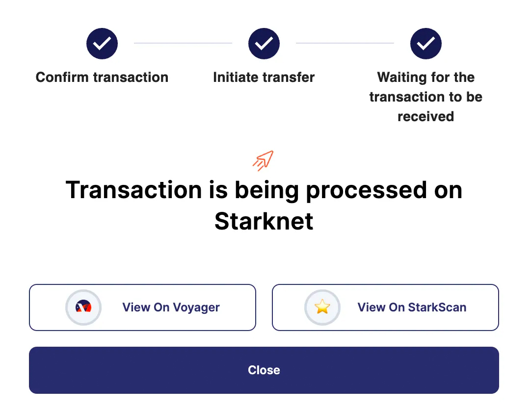 Once the transaction is confirmed, you can check the status of your transaction on Starkscan or Voyager.