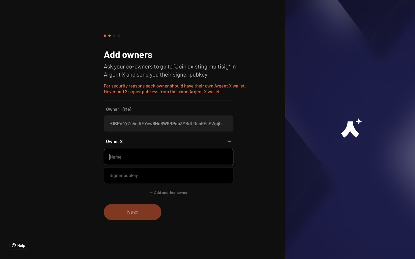Your signer pubkey is generated from the Ledger. You can now add the signer pubkeys of the other multisig owners and click “Next”. You can add as many signers/owners as you want.