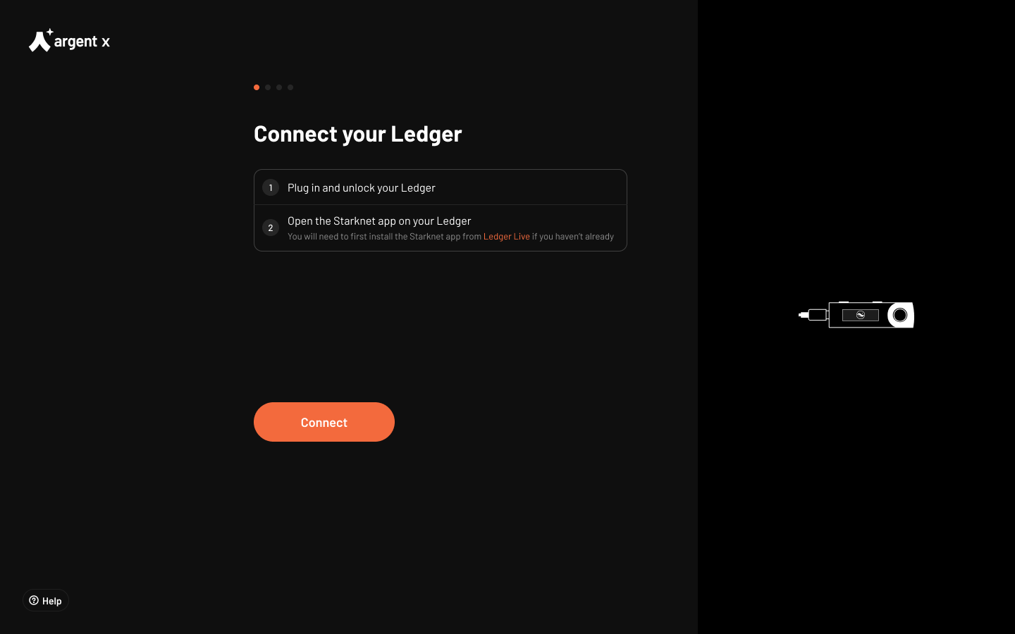 You will be prompted to plug in and unlock your Ledger. Then, open the Starknet app in Ledger and click “Connect”.
