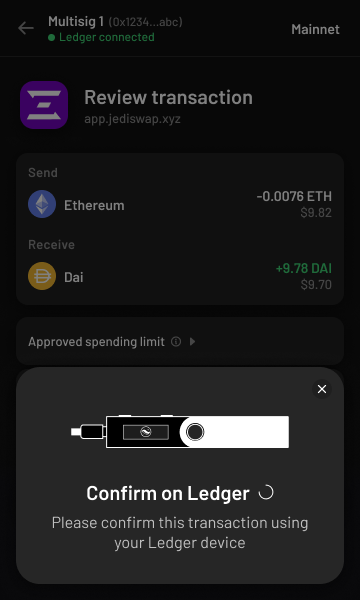 Next time you need to sign a multisig transaction, you will be prompted to connect and confirm with Ledger.