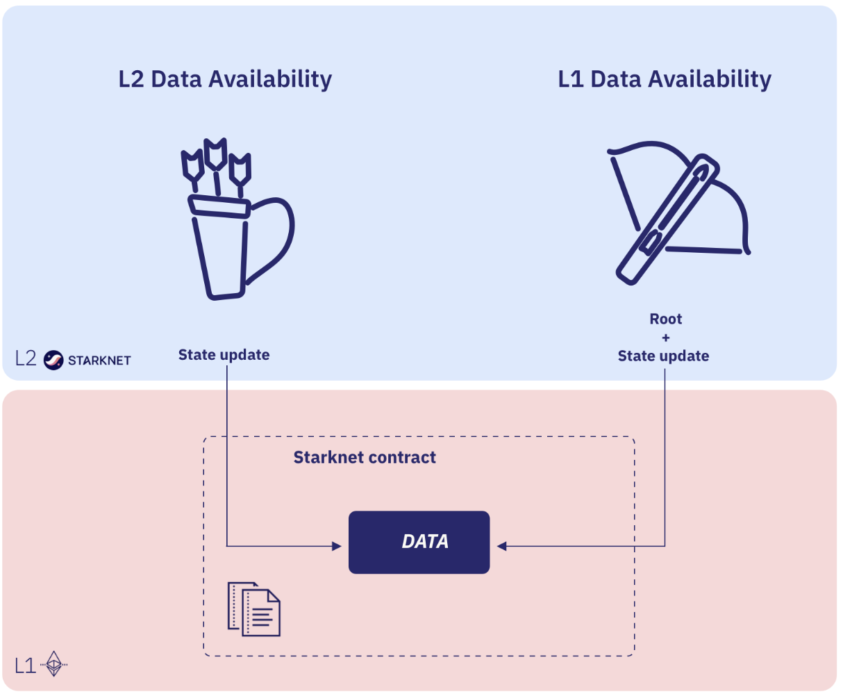 Imagine you participate in a high-profile Web 3 game on an app that is built on Starknet. You successfully bid on and purchase a prime NFT of a crossbow. Given the importance of this transaction, you may choose onchain data availability mode. This will ensure the ownership of the crossbow is securely recorded on the Ethereum blockchain, benefiting its wide decentralization. Subsequently, you decide to buy 150 arrow NFTs. Since this purchase is of lower value, you may opt for L2 Data availability to complete the transaction, allowing you to save on costs.