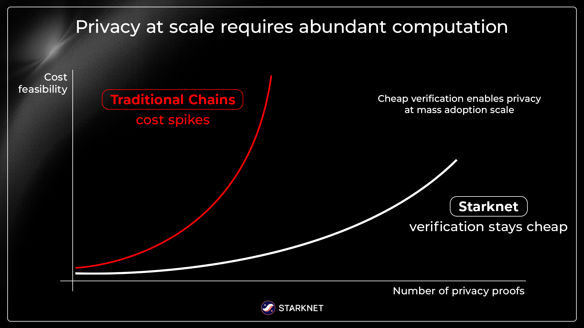 Private computation requires a lot of proving and verifying, something most chains simply can’t support. However, because Starknet is ZK-native, computation is both abundant and cheap: